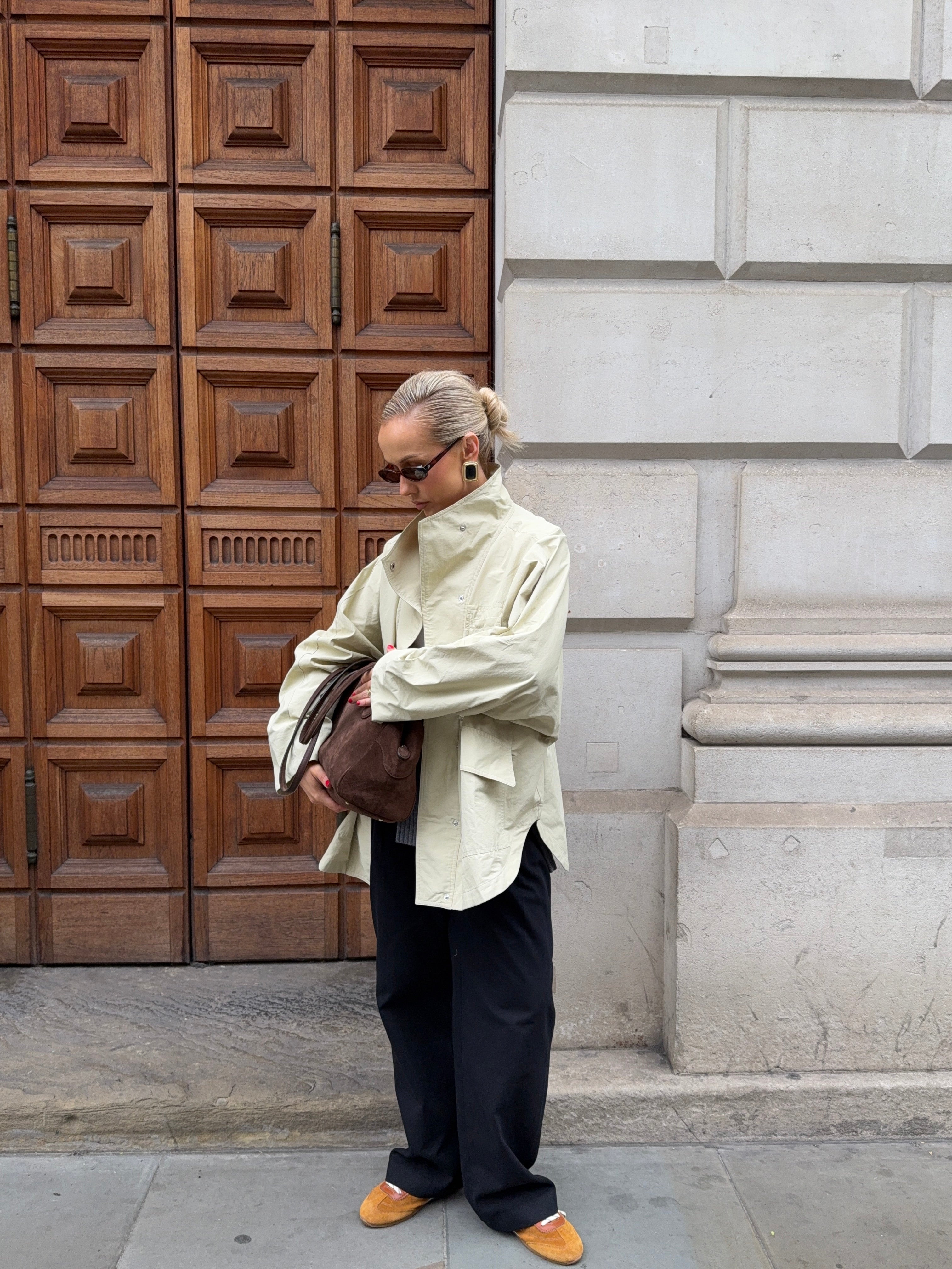 Cut from a cotton–nylon blend, it’s designed to move seamlessly from city to countryside. The high funnel neck and perfectly oversized fit make layering effortless, while three generous patch pockets prove that one is never enough. A coat to throw on with jeans, dresses, or knitwear - an easy winter layer you’ll wear all season.