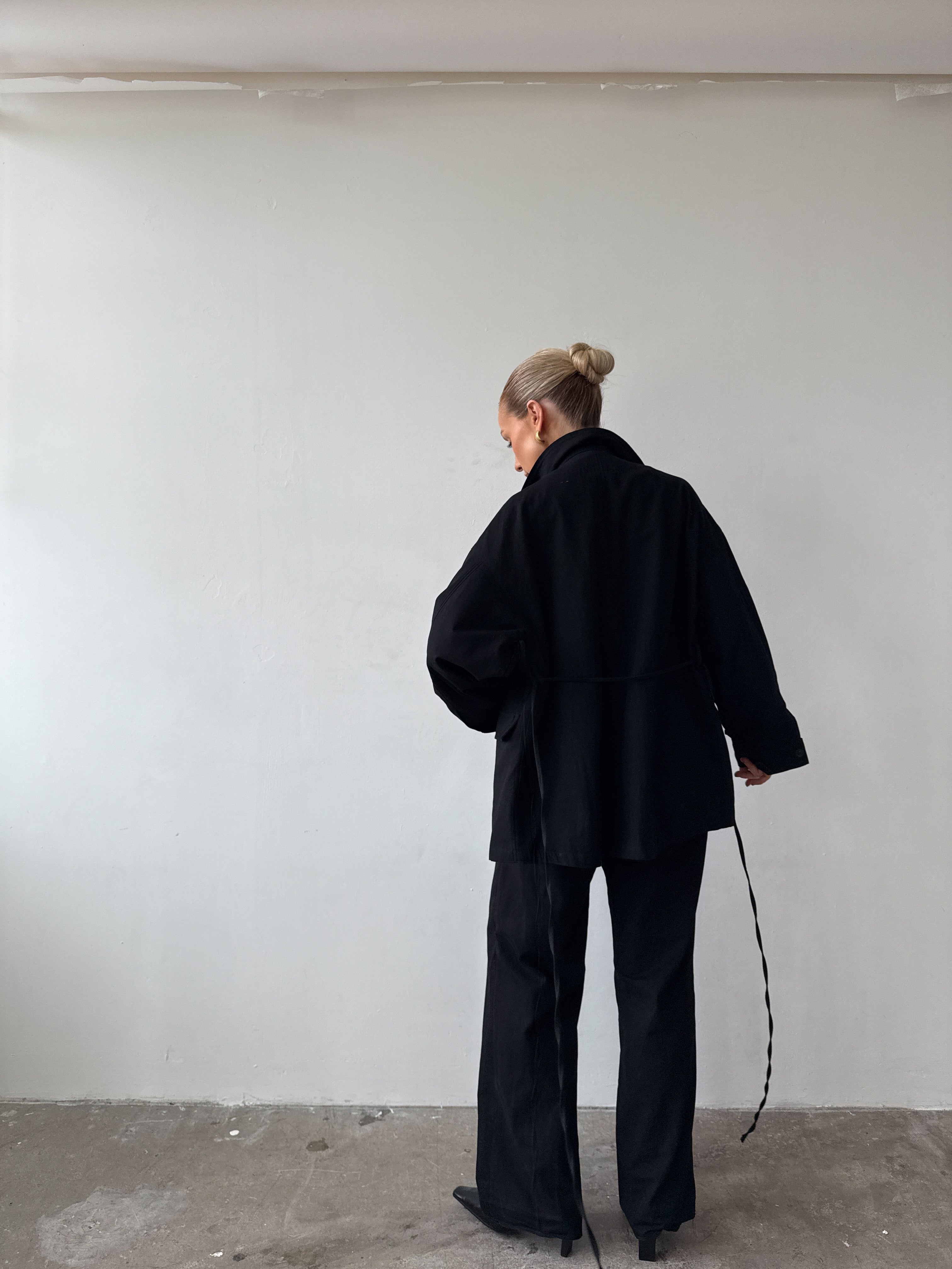 Made from structured cotton canvas in Jet Black; it features four front patch pockets, wide sleeves, and a gently boxy, lightly oversized silhouette. A subtle tie at the back adds shape and adjustability, offering an easy balance of structure and softness.