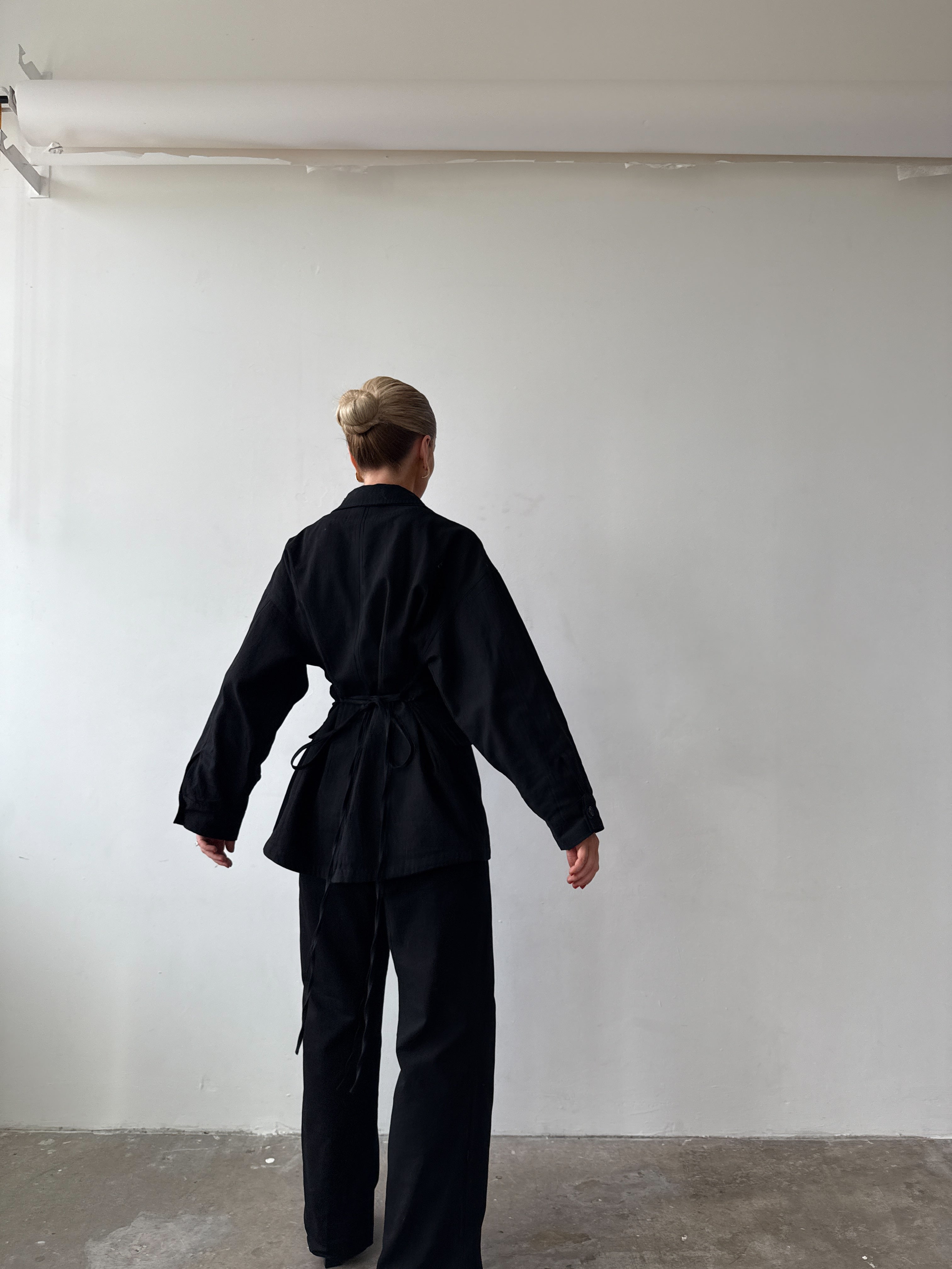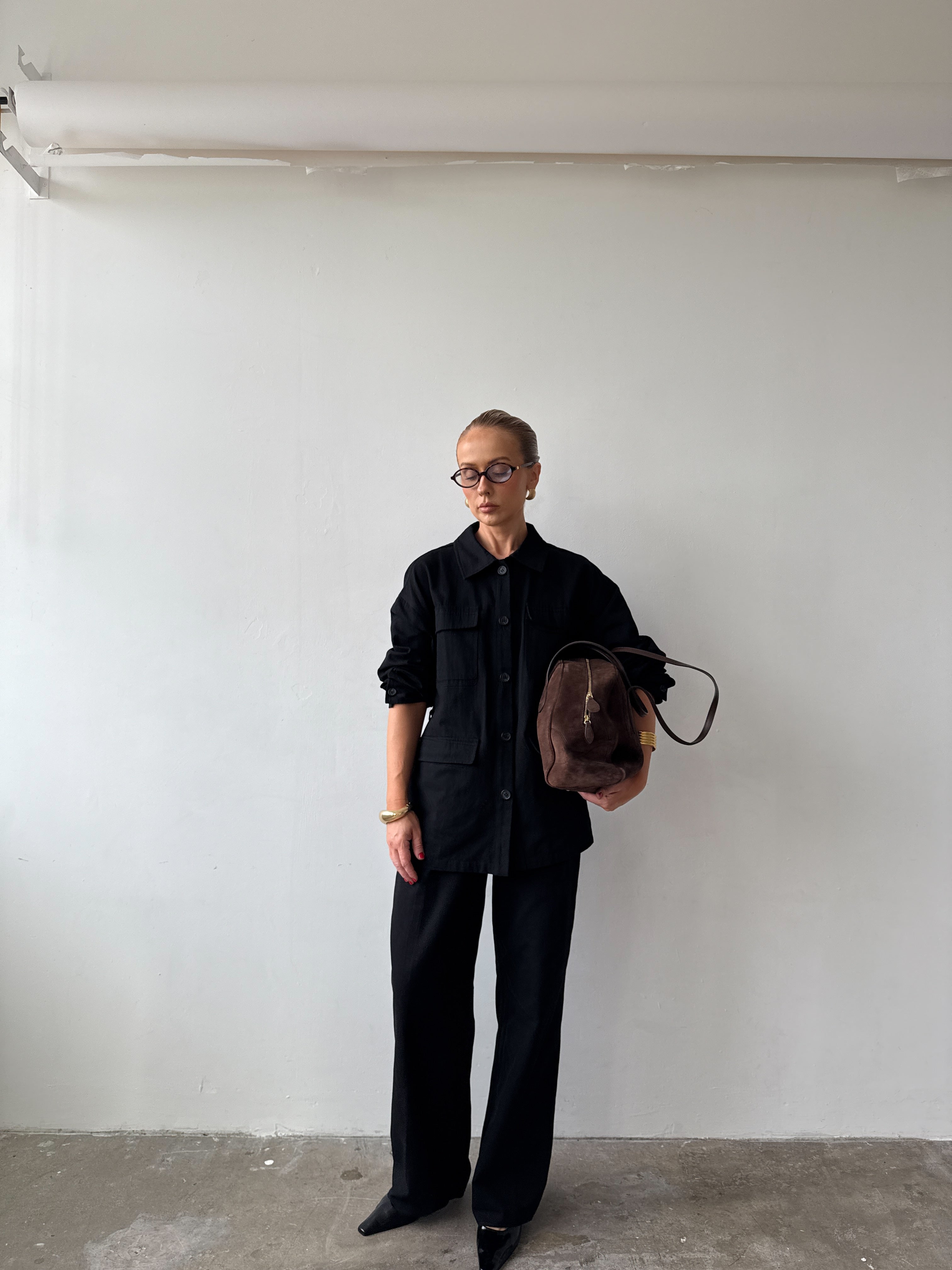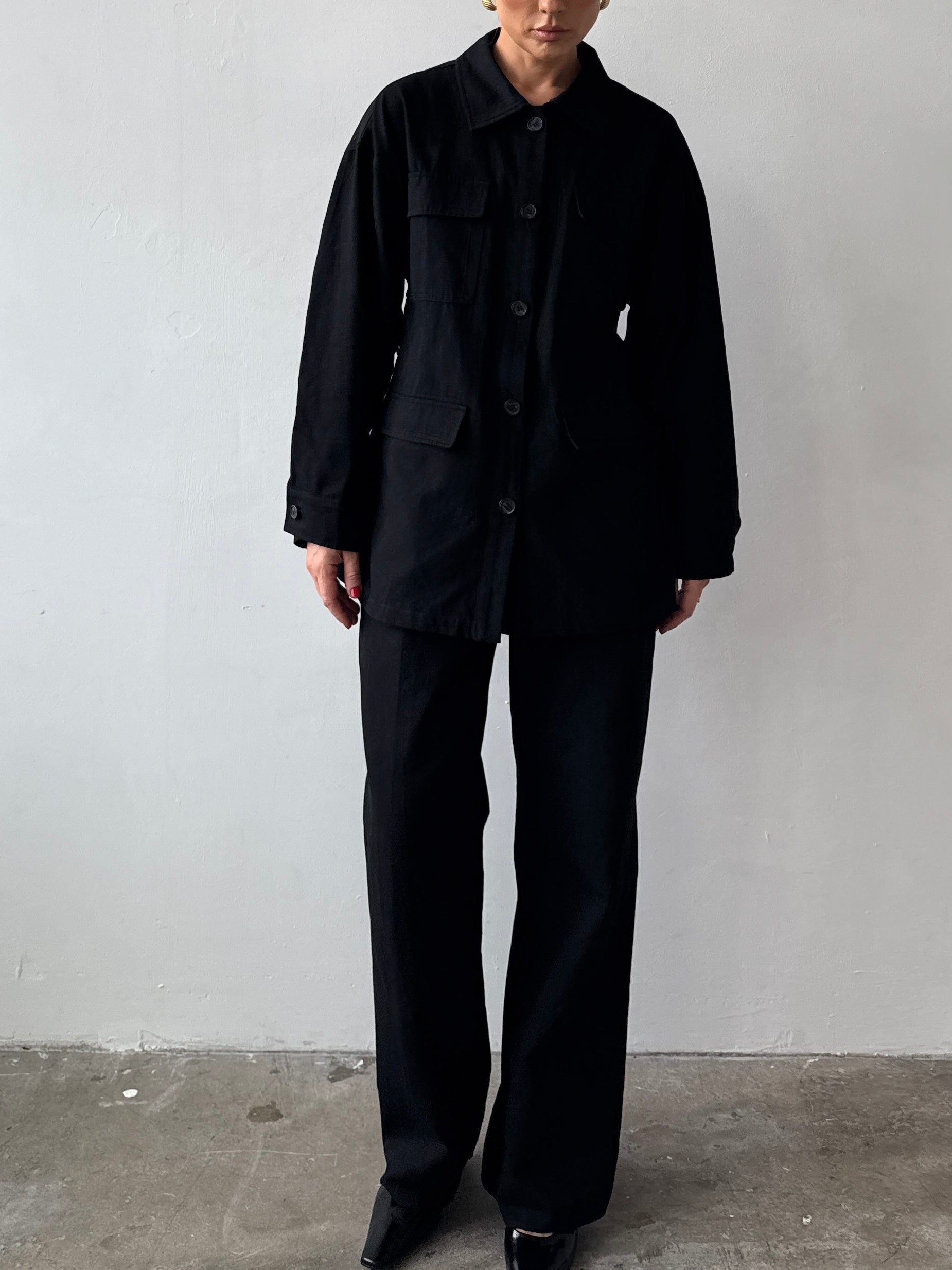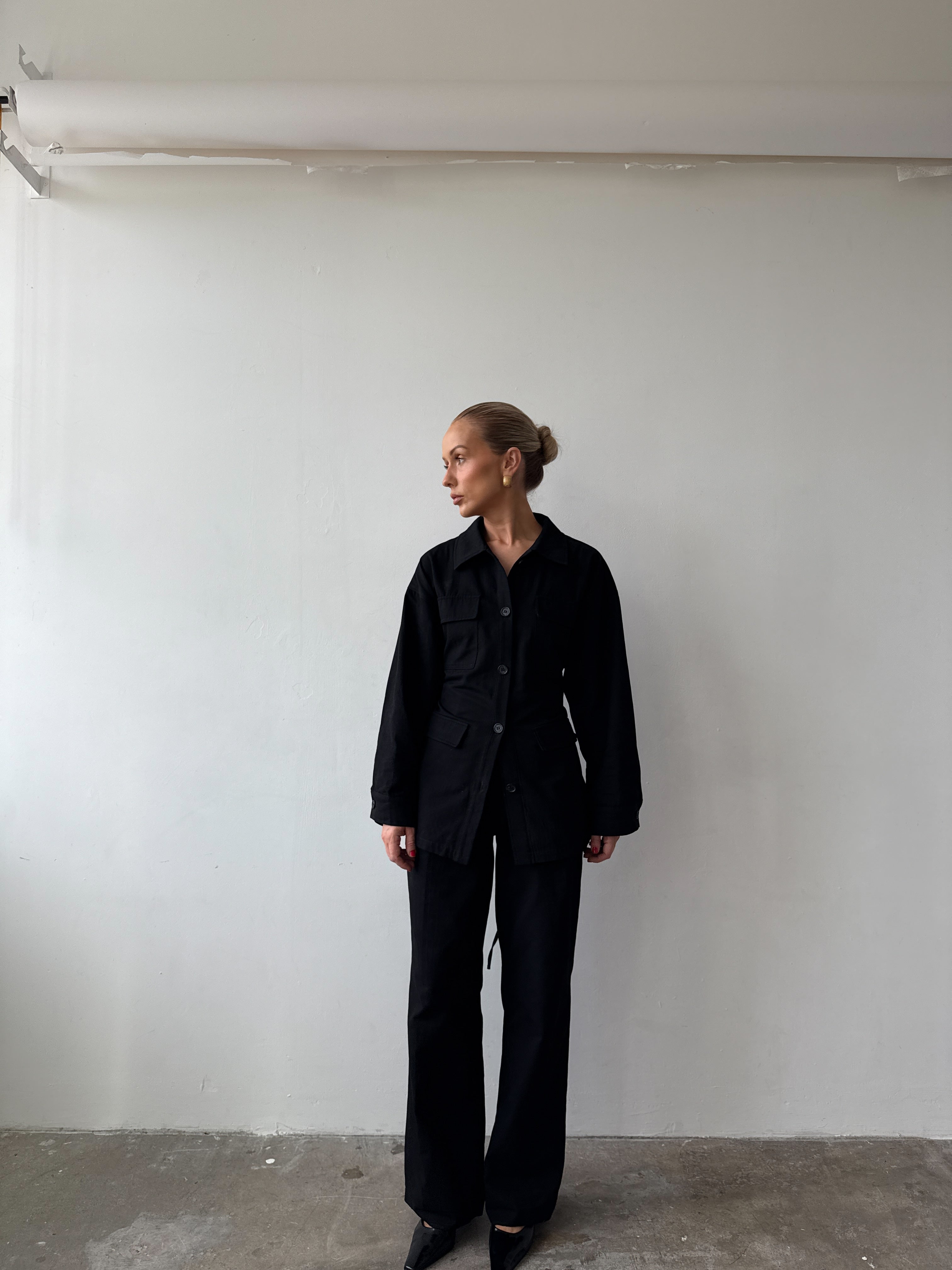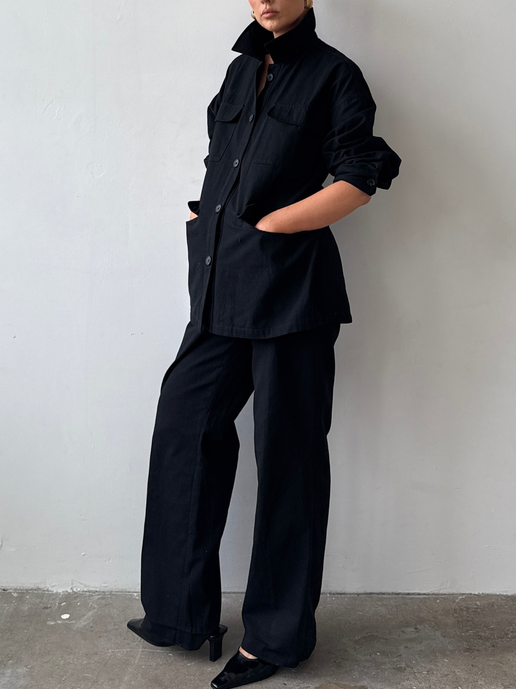 Made from structured cotton canvas in Jet Black; it features four front patch pockets, wide sleeves, and a gently boxy, lightly oversized silhouette. A subtle tie at the back adds shape and adjustability, offering an easy balance of structure and softness.