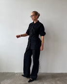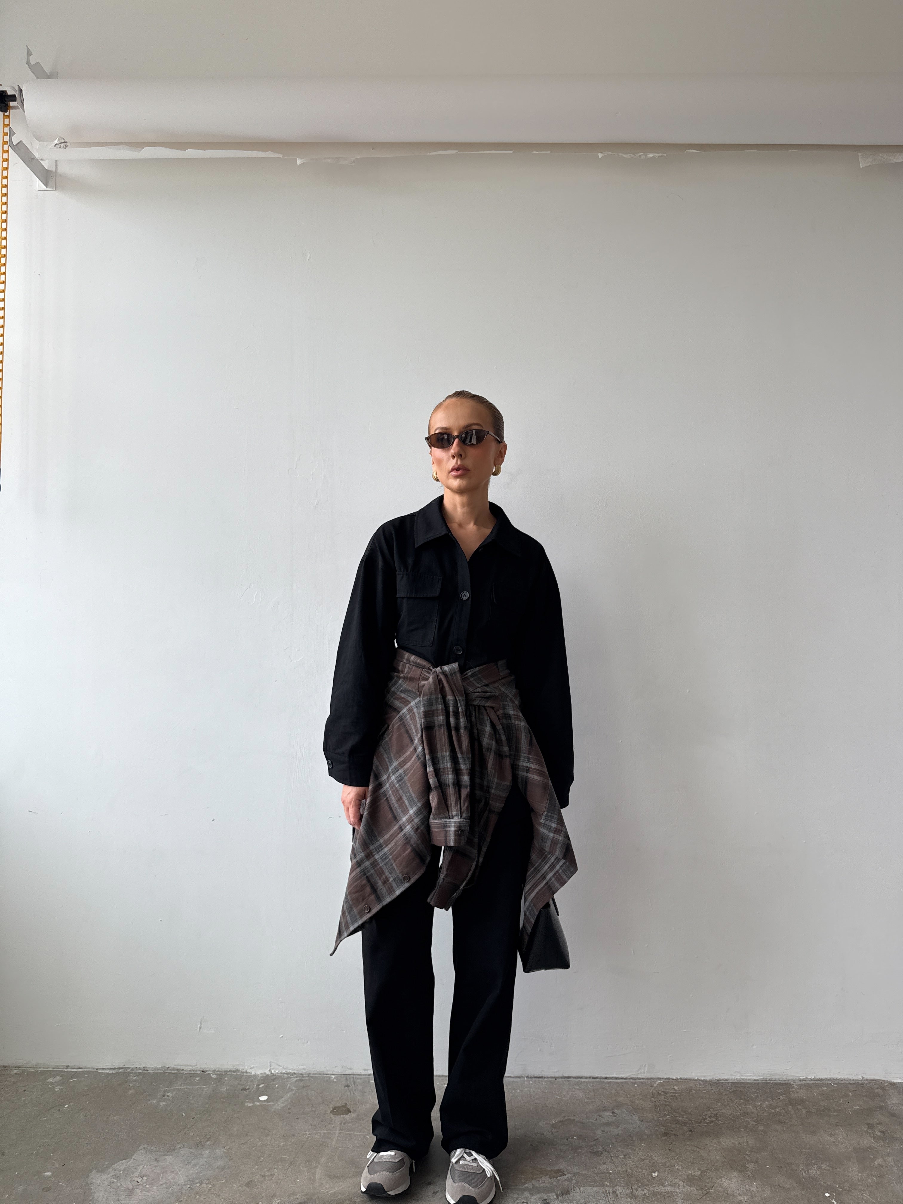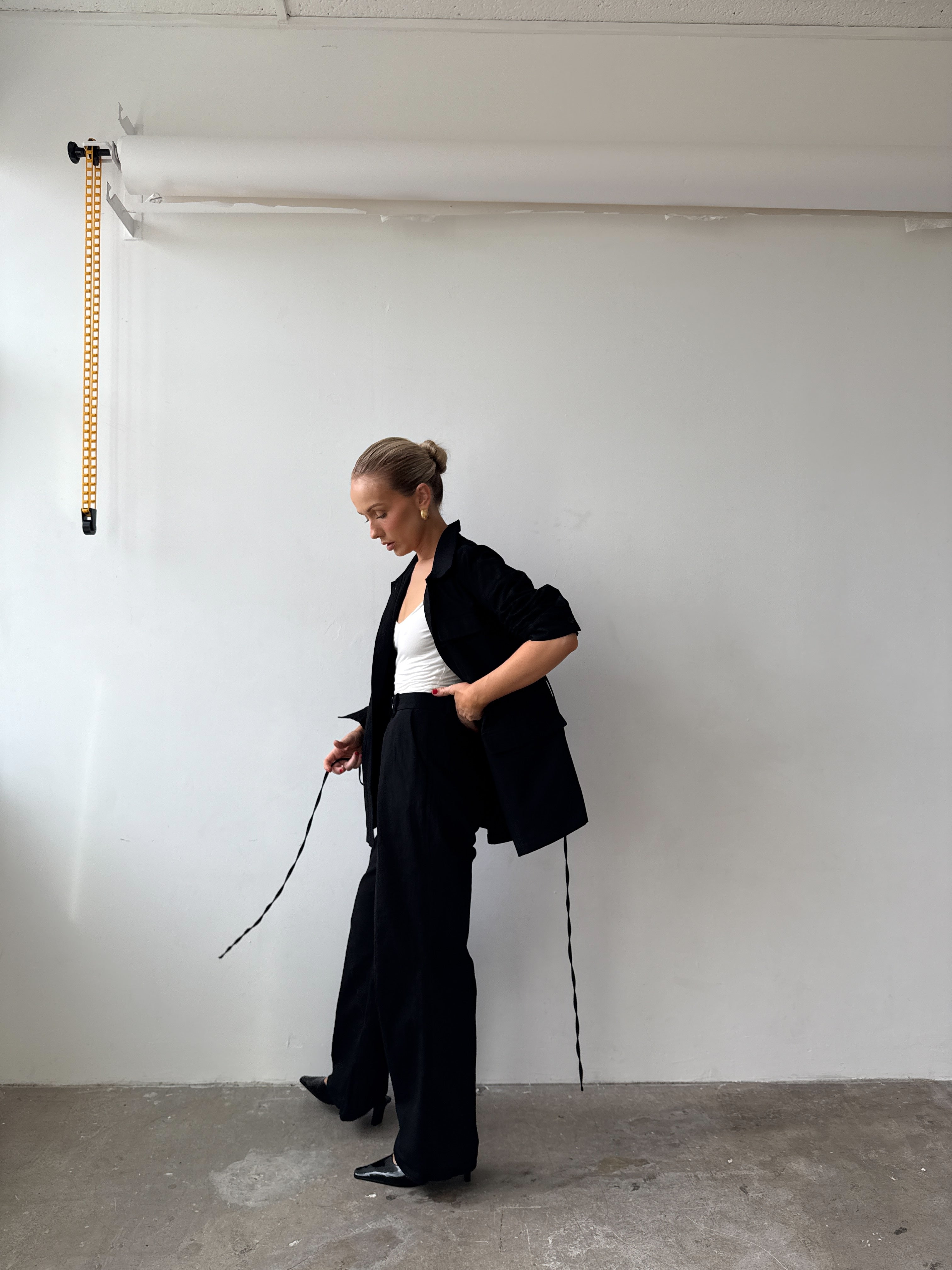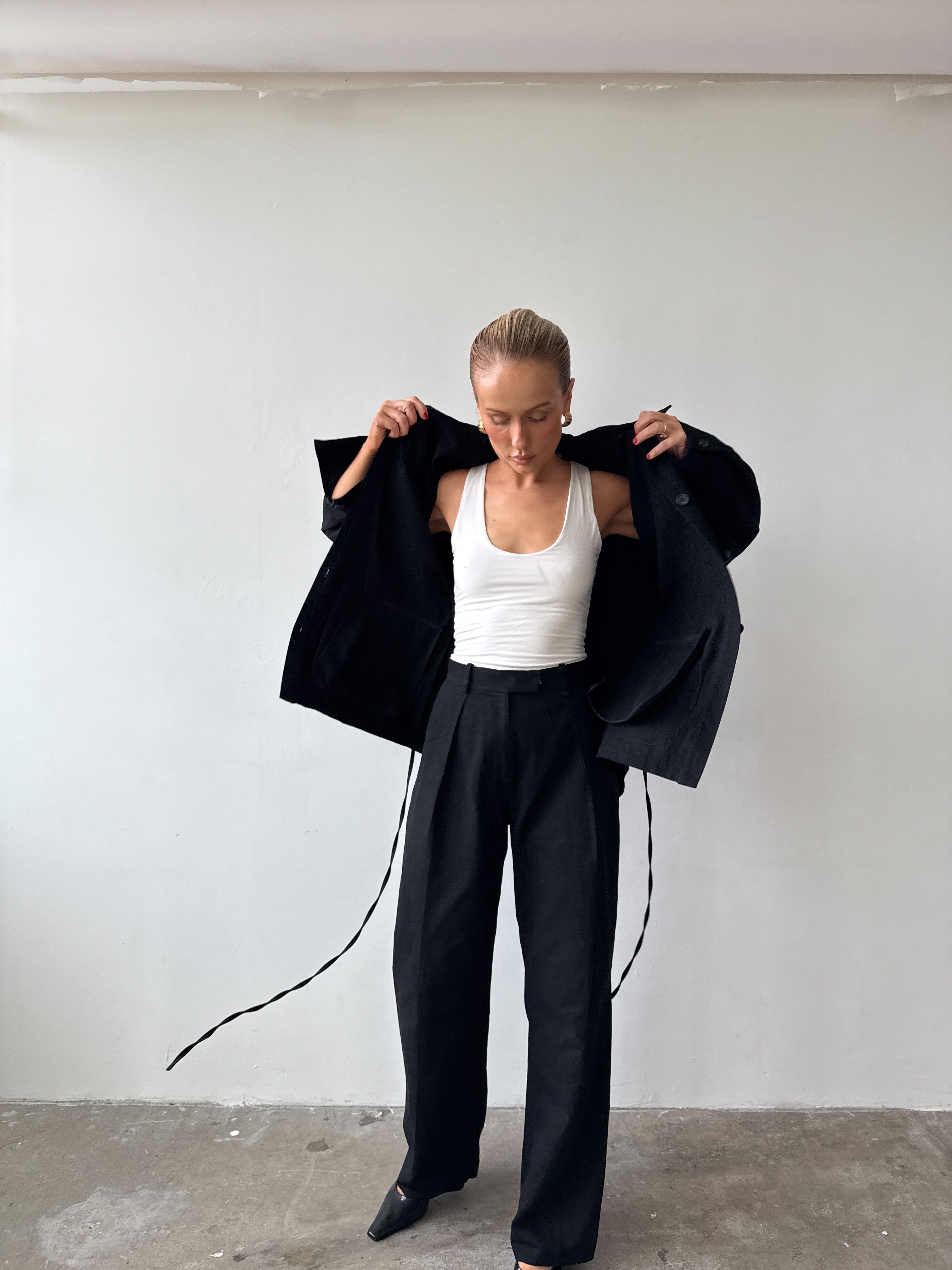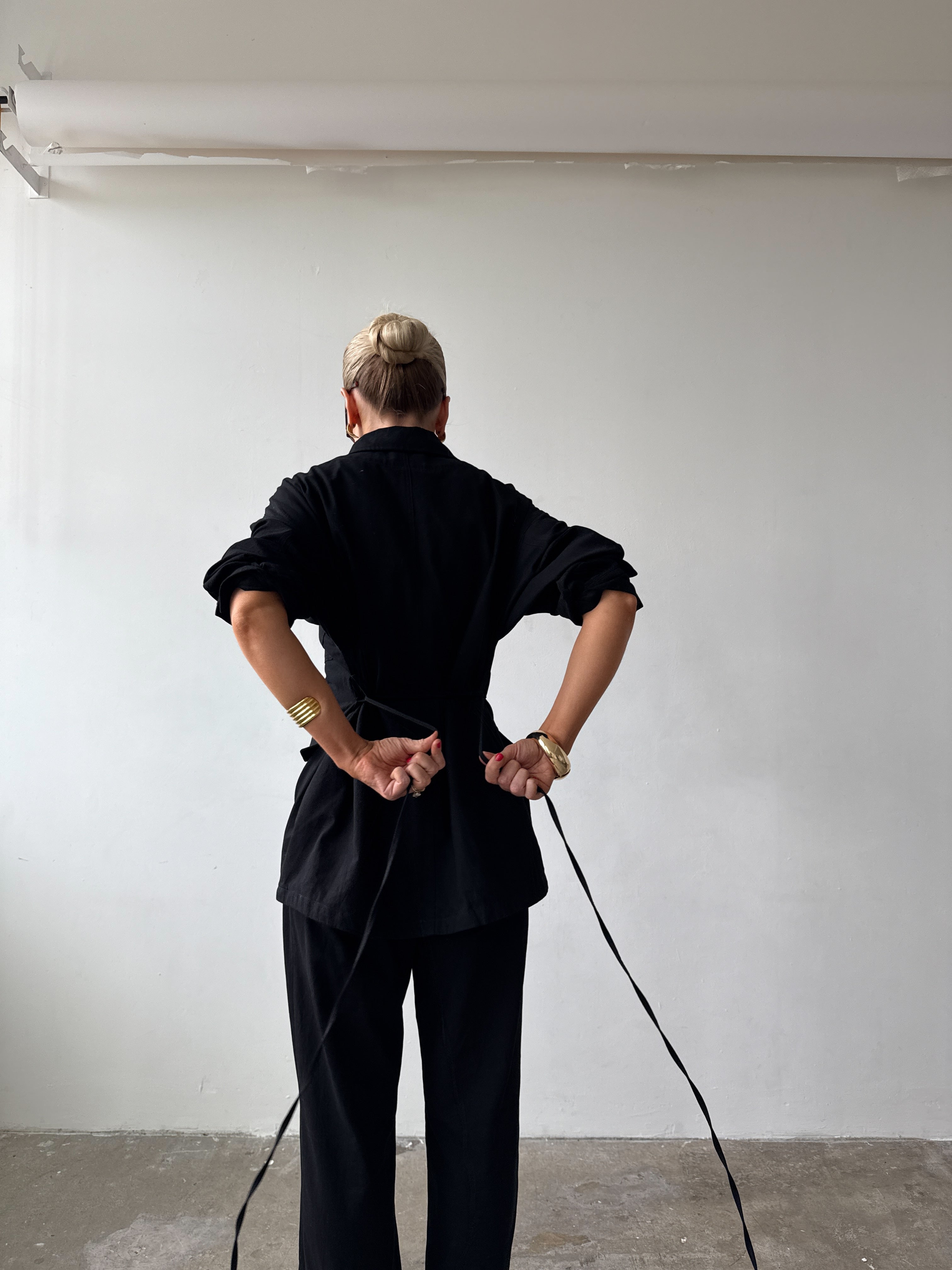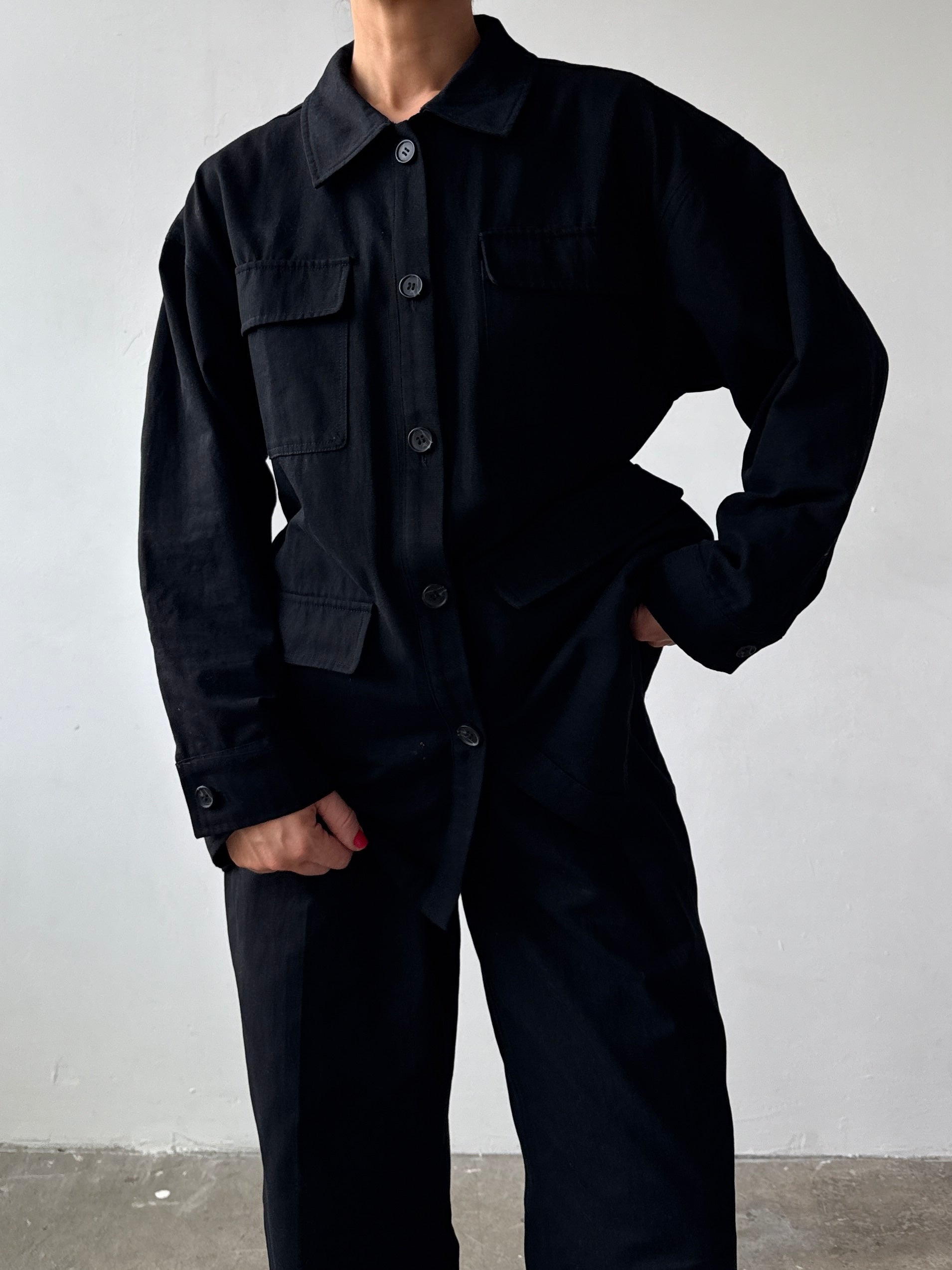 Made from structured cotton canvas in Jet Black; it features four front patch pockets, wide sleeves, and a gently boxy, lightly oversized silhouette. A subtle tie at the back adds shape and adjustability, offering an easy balance of structure and softness.