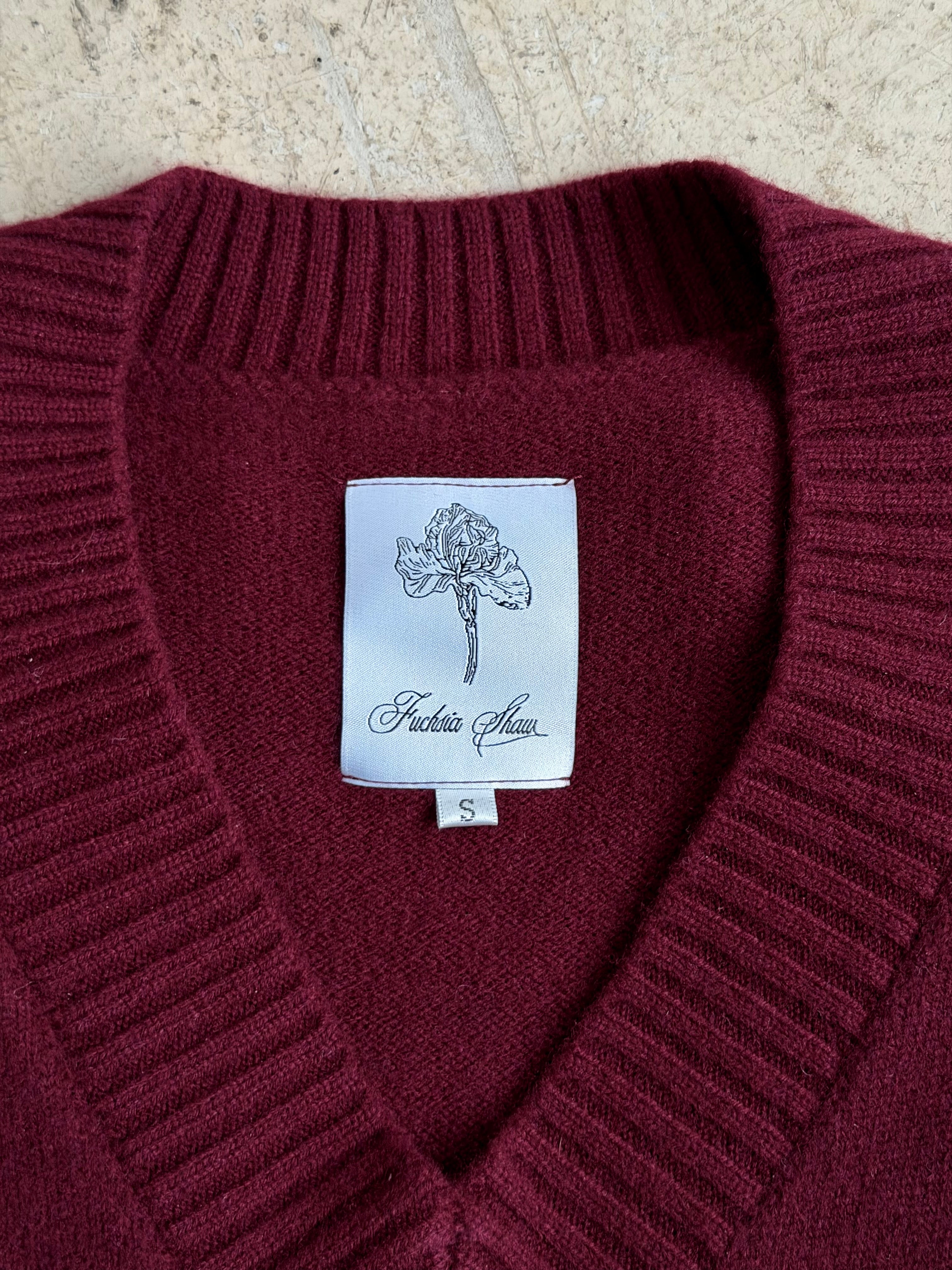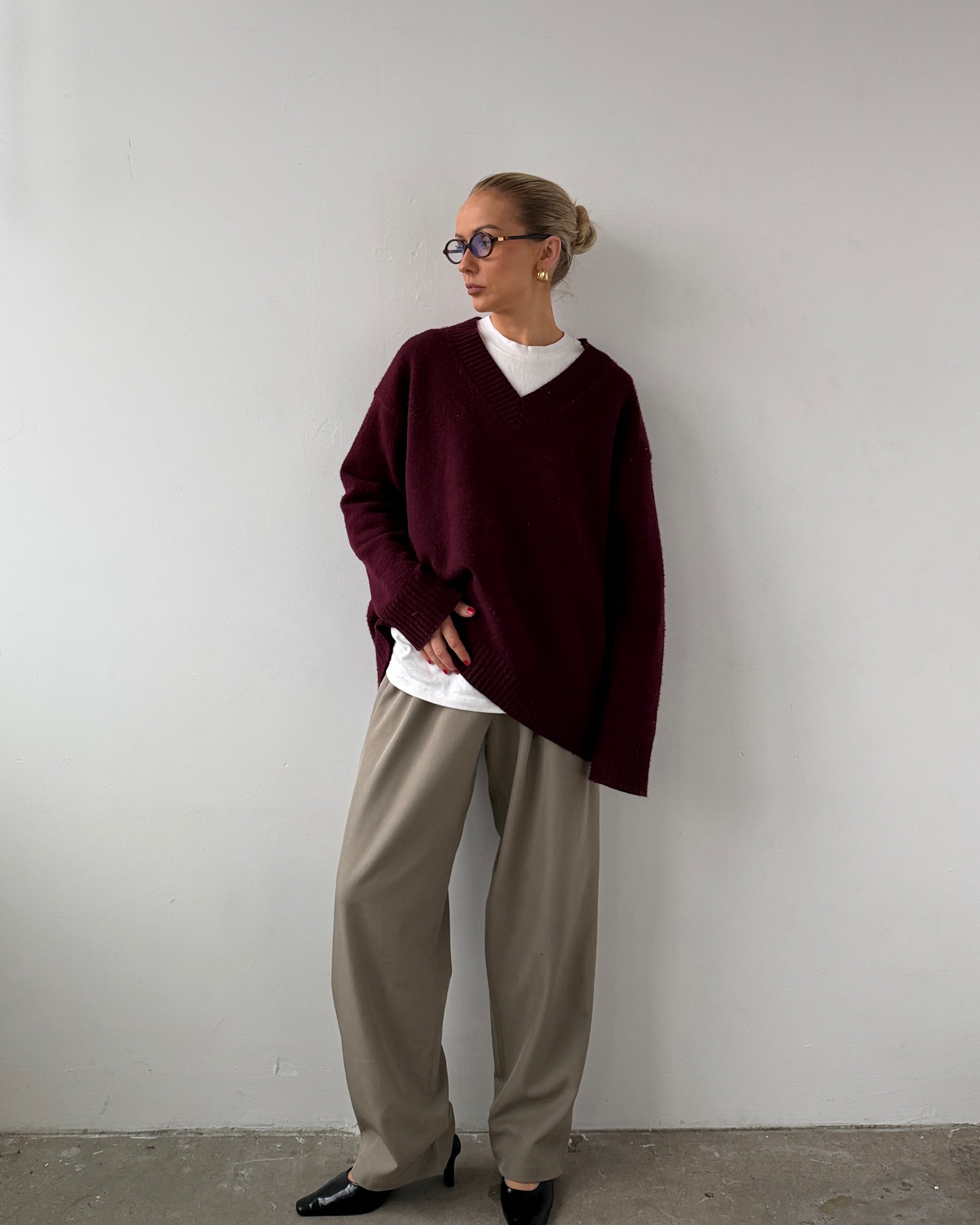 Knitted from 100% pure wool in a rich merlot hue, it drapes softly against the body with a natural weight that feels both comforting and elevated. The deep neckline flatters without effort, while the dropped shoulders and relaxed fit evoke an easy sophistication — perfect layered over crisp shirting or worn alone.