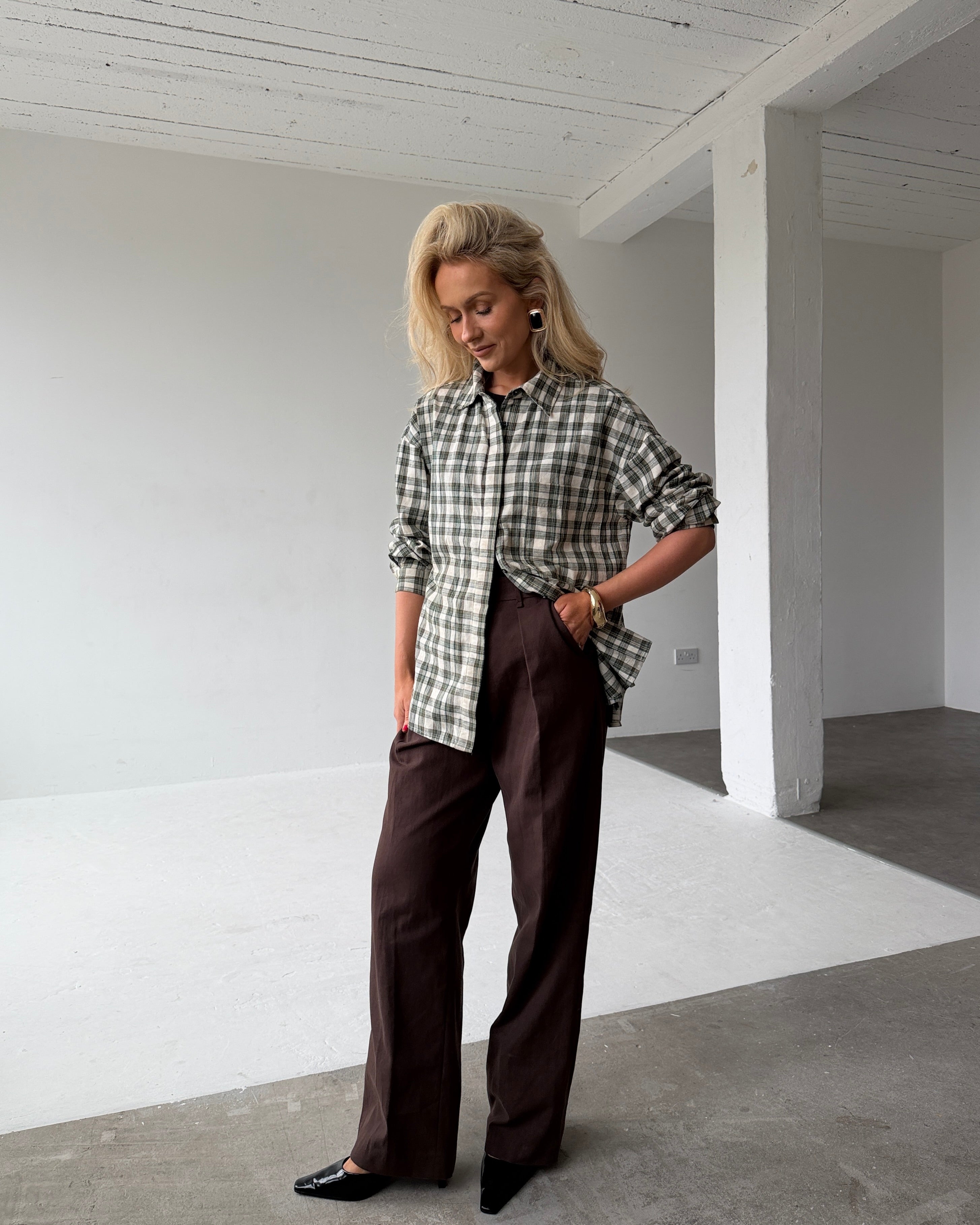 Cut from crisp cotton in a timeless check, it features dropped shoulders, a neat collar, and considered proportions that make it easy to style open or buttoned up. The back pleat adds subtle volume, while the longer hem lends itself to half-tucks, layering, or tying at the waist.