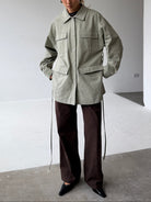 Made from structured cotton canvas in Eucalyptus; it features four front patch pockets, wide sleeves, and a gently boxy, lightly oversized silhouette. A subtle tie at the back adds shape and adjustability, offering an easy balance of structure and softness.