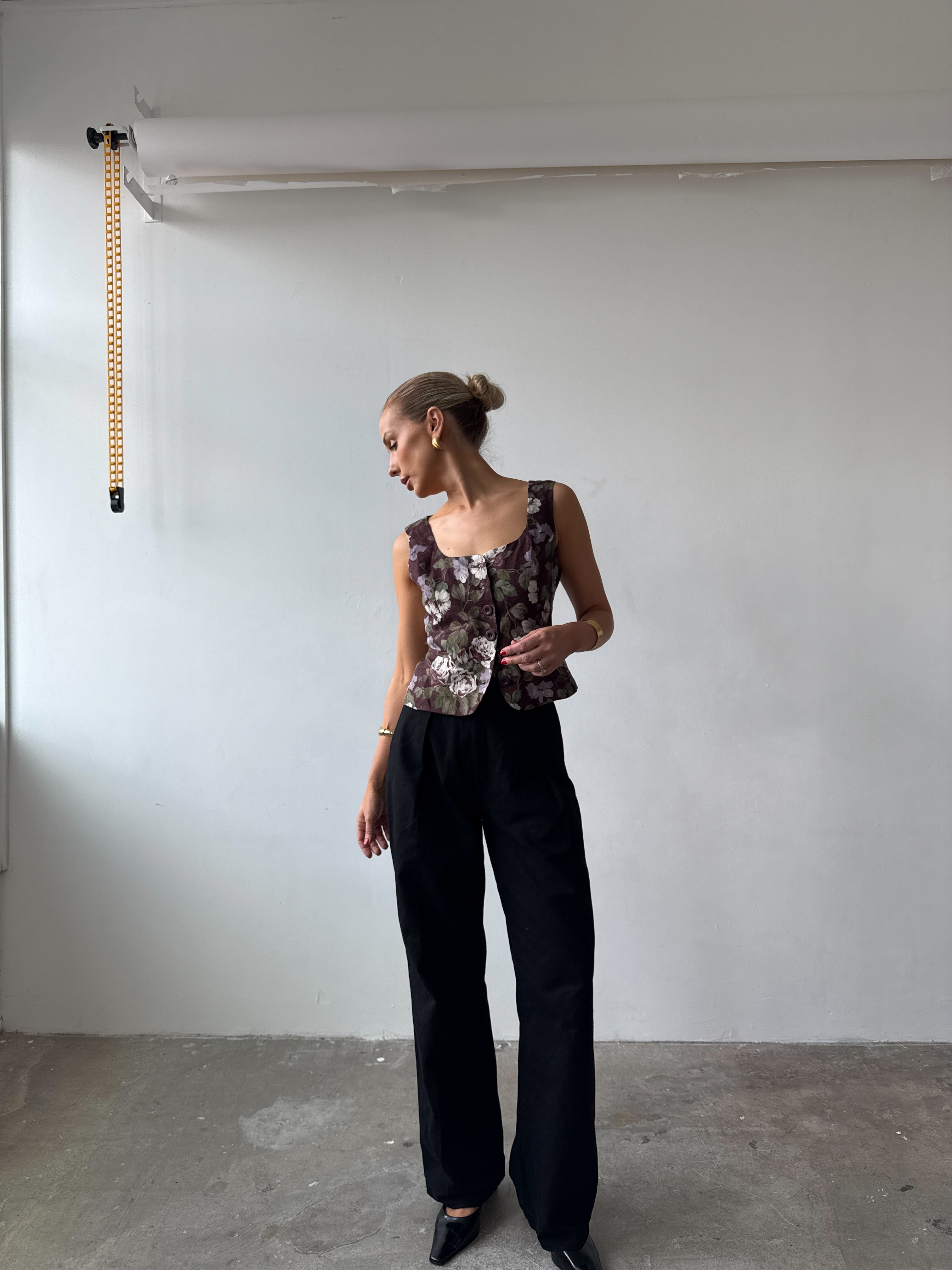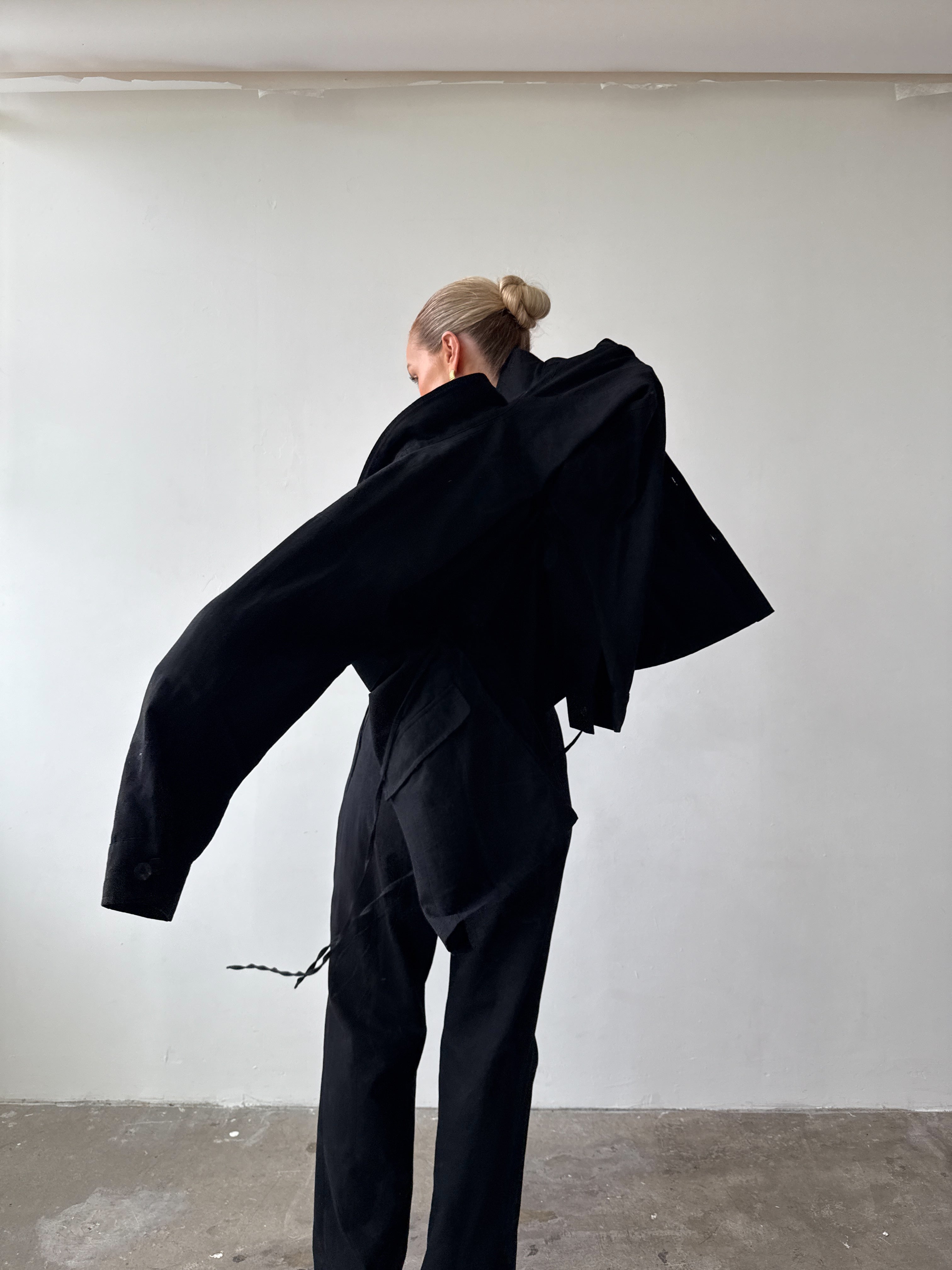Cut from a structured cotton canvas in black, they balance ease with sharpness. The front box pleats create a clean, flattering line, while functional side pockets and subtle back detailing stay true to our thoughtful approach to design.