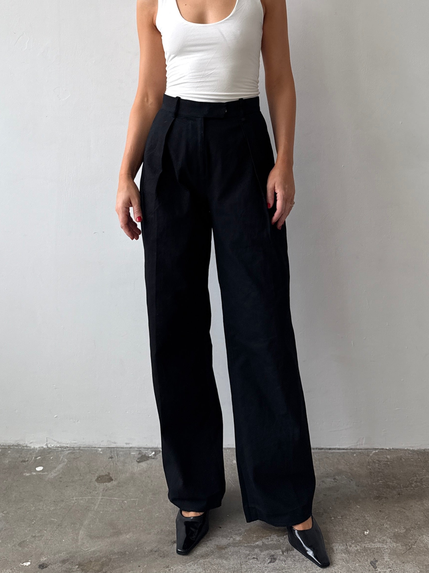 Cut from a structured cotton canvas in black, they balance ease with sharpness. The front box pleats create a clean, flattering line, while functional side pockets and subtle back detailing stay true to our thoughtful approach to design.