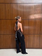The Iris Top takes soft shirting fabric (the kind you’d wear to the market) and transforms it into a glam, backless silhouette with a draped halter neck and asymmetric hem. The result is unexpected but effortless: a piece that makes the whole outfit feel styled without trying.