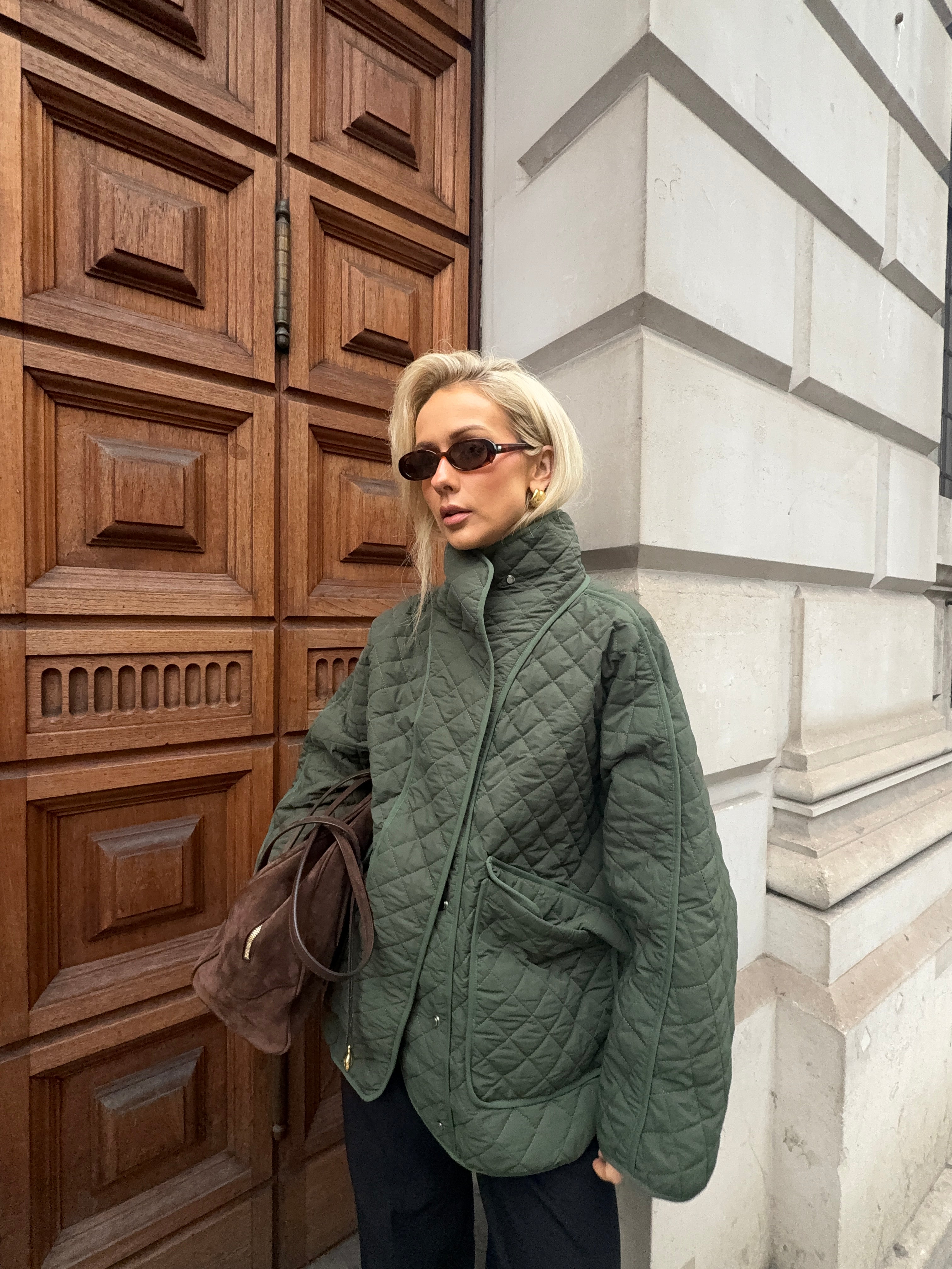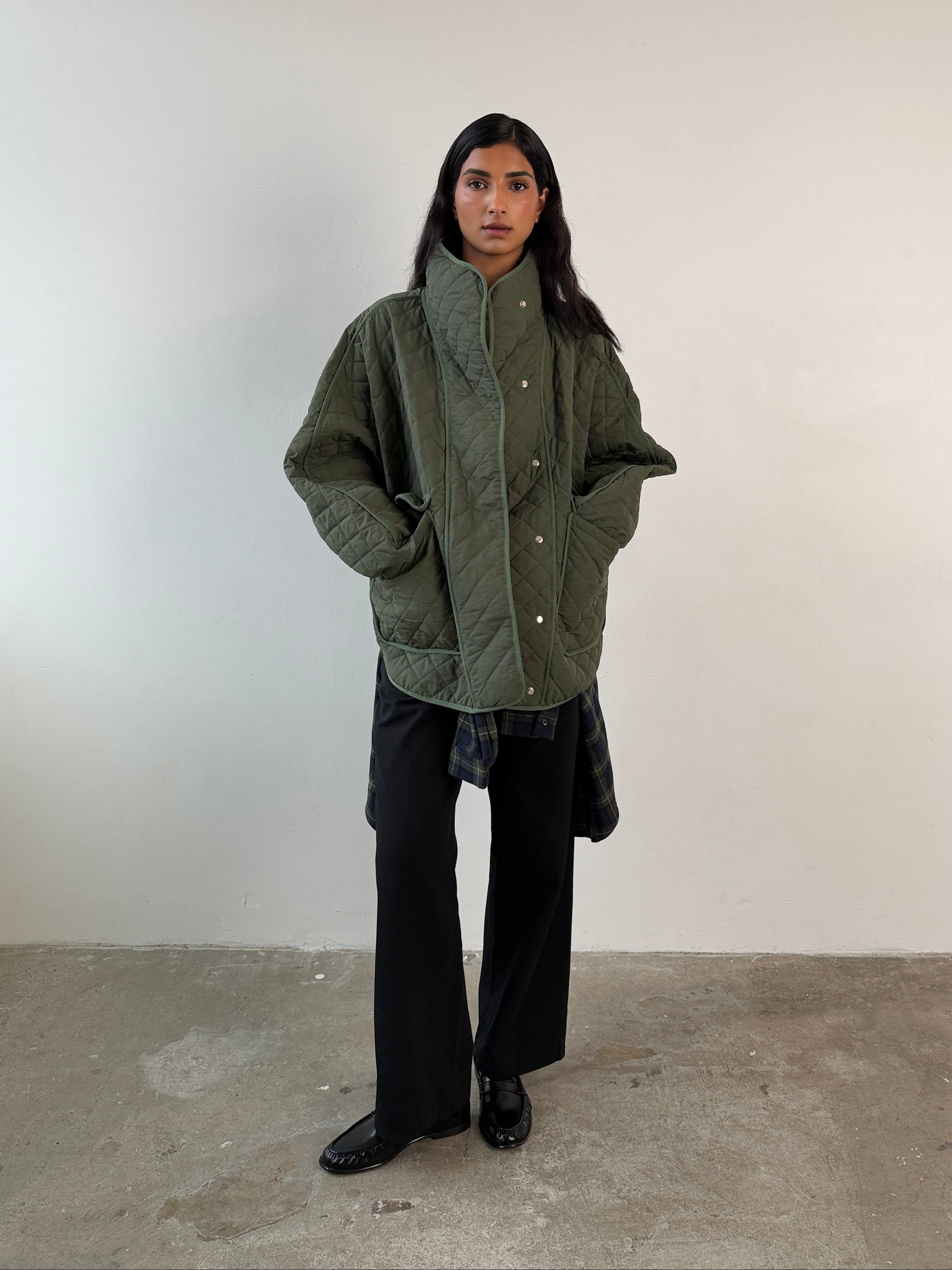 Cut from the same shower-proof cotton–nylon blend, this version layers a soft quilted interior beneath its clean, oversized silhouette. The signature funnel neck remains, offering quiet structure and warmth, while subtle popper fastenings and two generous patch pockets keep the design practical. Finished in a deep forest green, it moves seamlessly between city and countryside: an easy layer to throw on over knitwear, denim, or dresses, all season long.