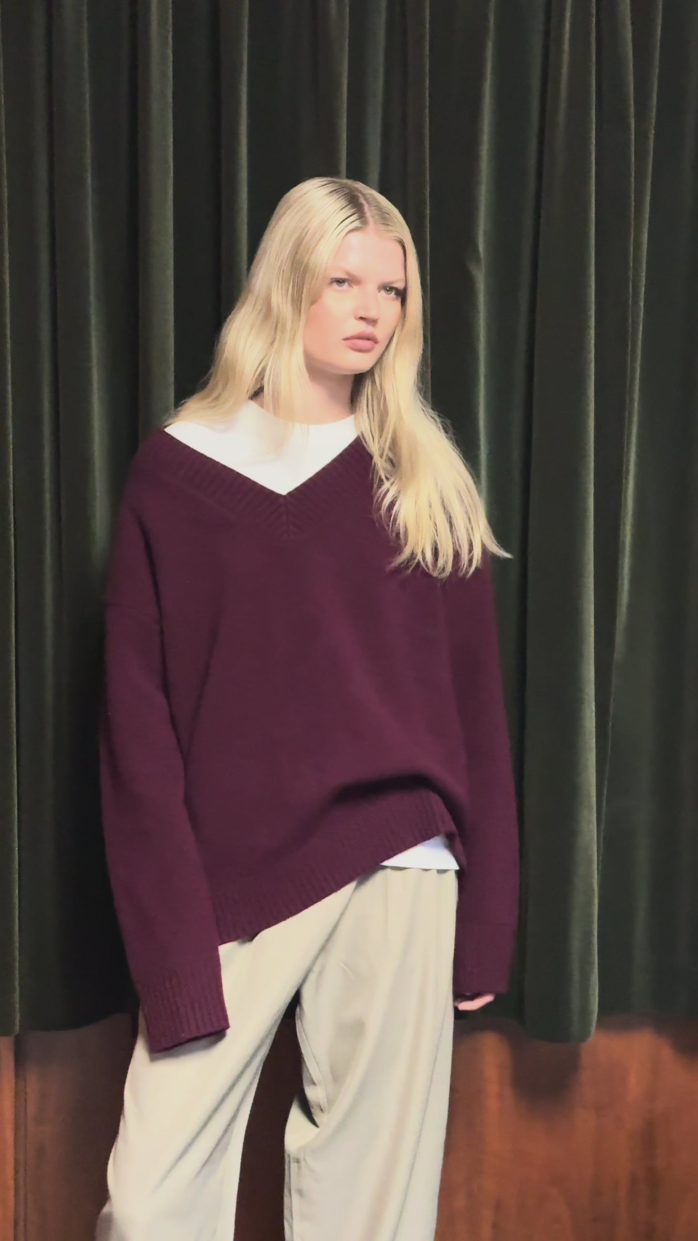 Knitted from 100% pure wool in a rich merlot hue, it drapes softly against the body with a natural weight that feels both comforting and elevated. The deep neckline flatters without effort, while the dropped shoulders and relaxed fit evoke an easy sophistication — perfect layered over crisp shirting or worn alone.