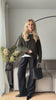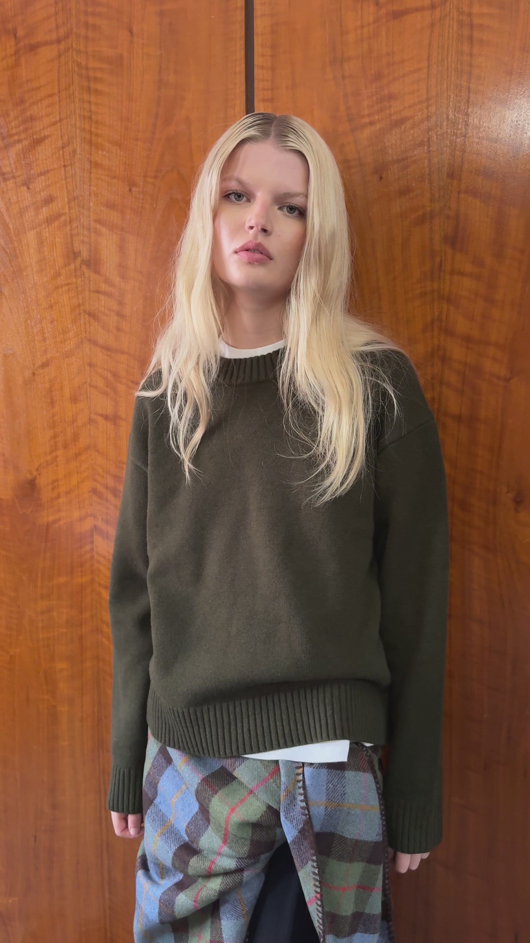 Knitted from 100% pure wool in a deep forest tone, it balances warmth with refinement: soft against the skin, naturally breathable, and designed to drape beautifully. Subtle ribbing at the neck, cuffs, and hem lends gentle structure, while the relaxed fit makes it an effortless layering piece from studio days to winter evenings.