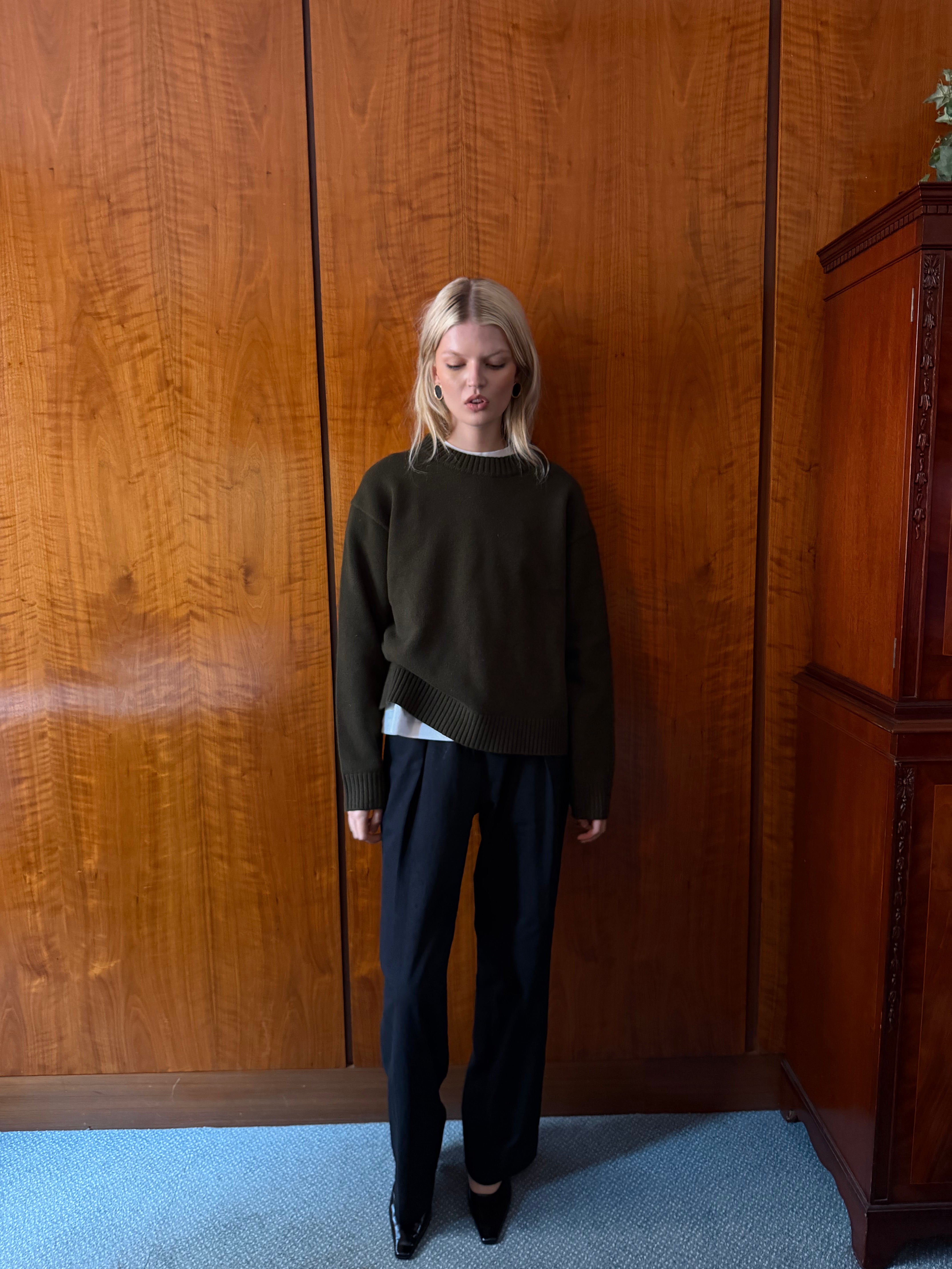 Knitted from 100% pure wool in a deep forest tone, it balances warmth with refinement: soft against the skin, naturally breathable, and designed to drape beautifully. Subtle ribbing at the neck, cuffs, and hem lends gentle structure, while the relaxed fit makes it an effortless layering piece from studio days to winter evenings.