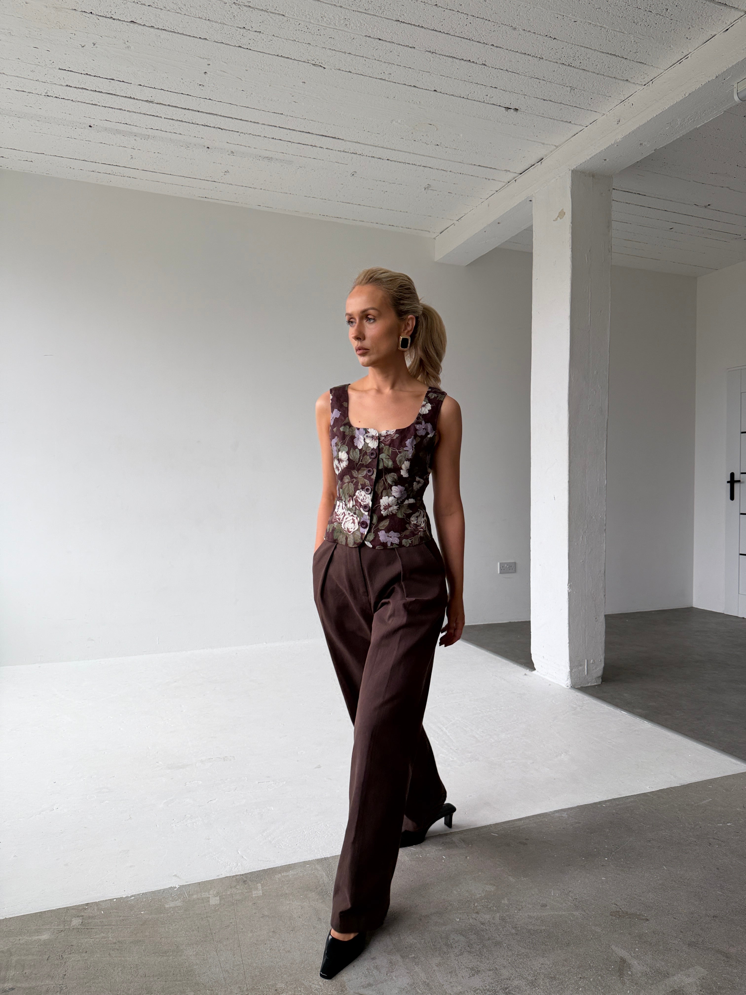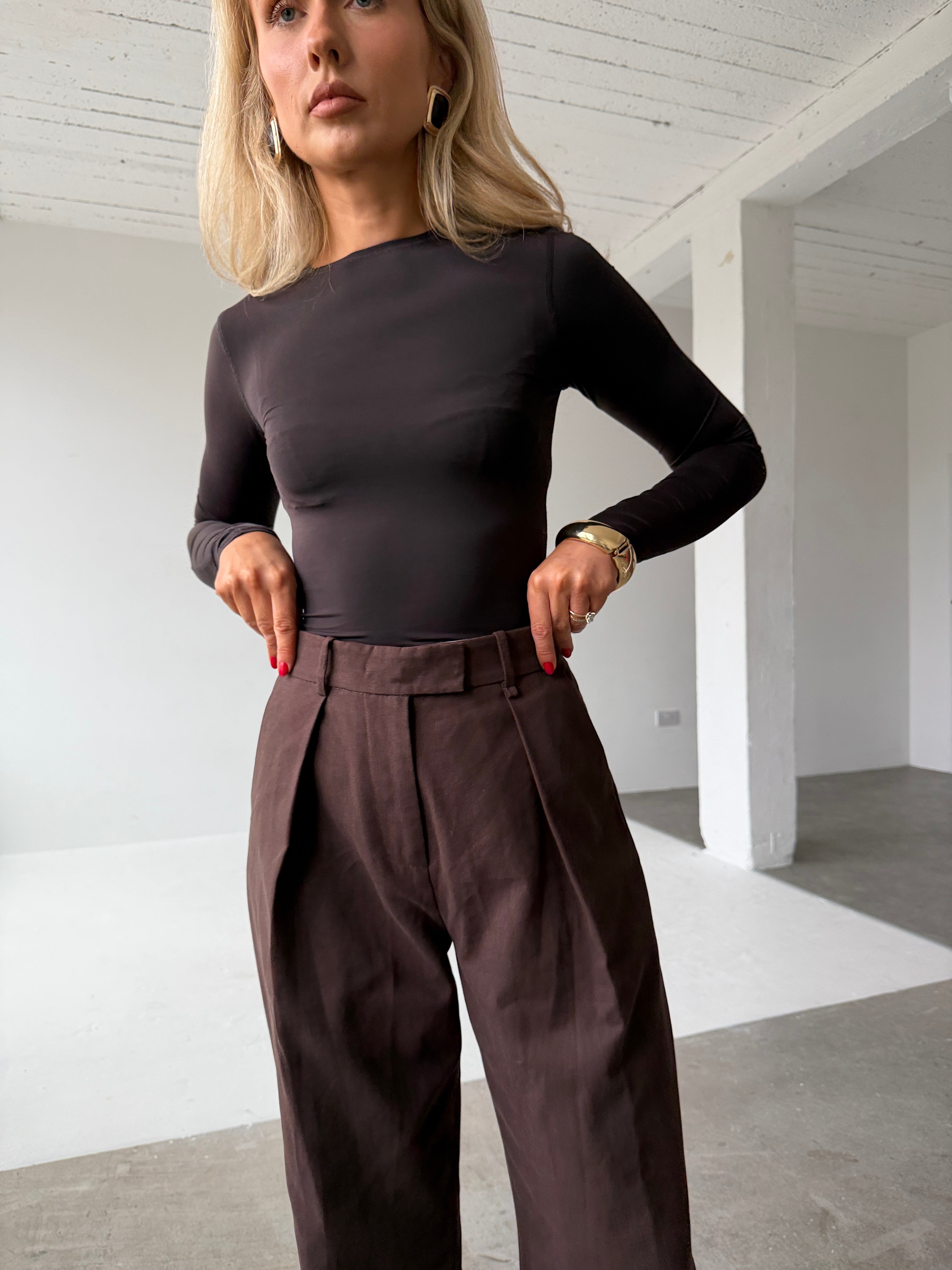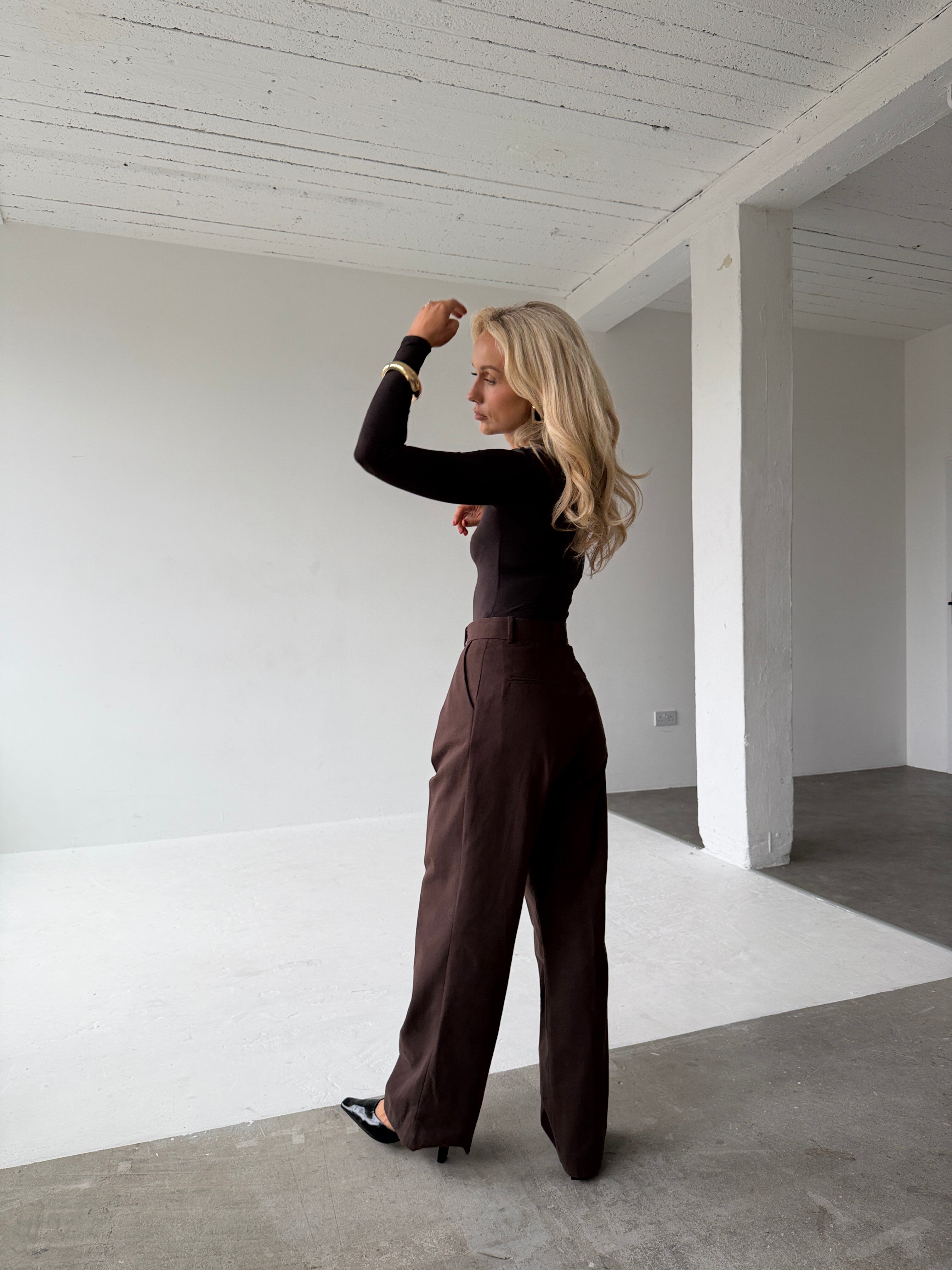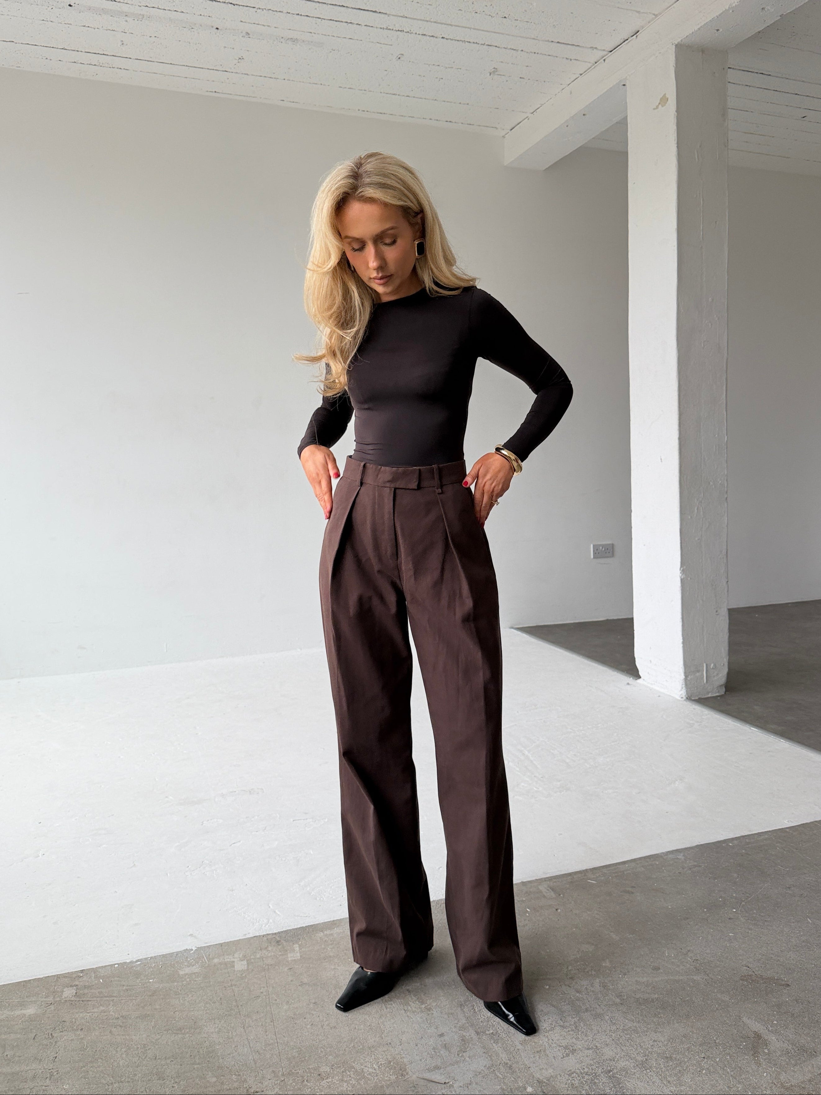 A new essential in the Fuchsia Shaw uniform, these tailored trousers in chocolate brown are a refined take on everyday dressing.