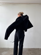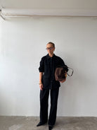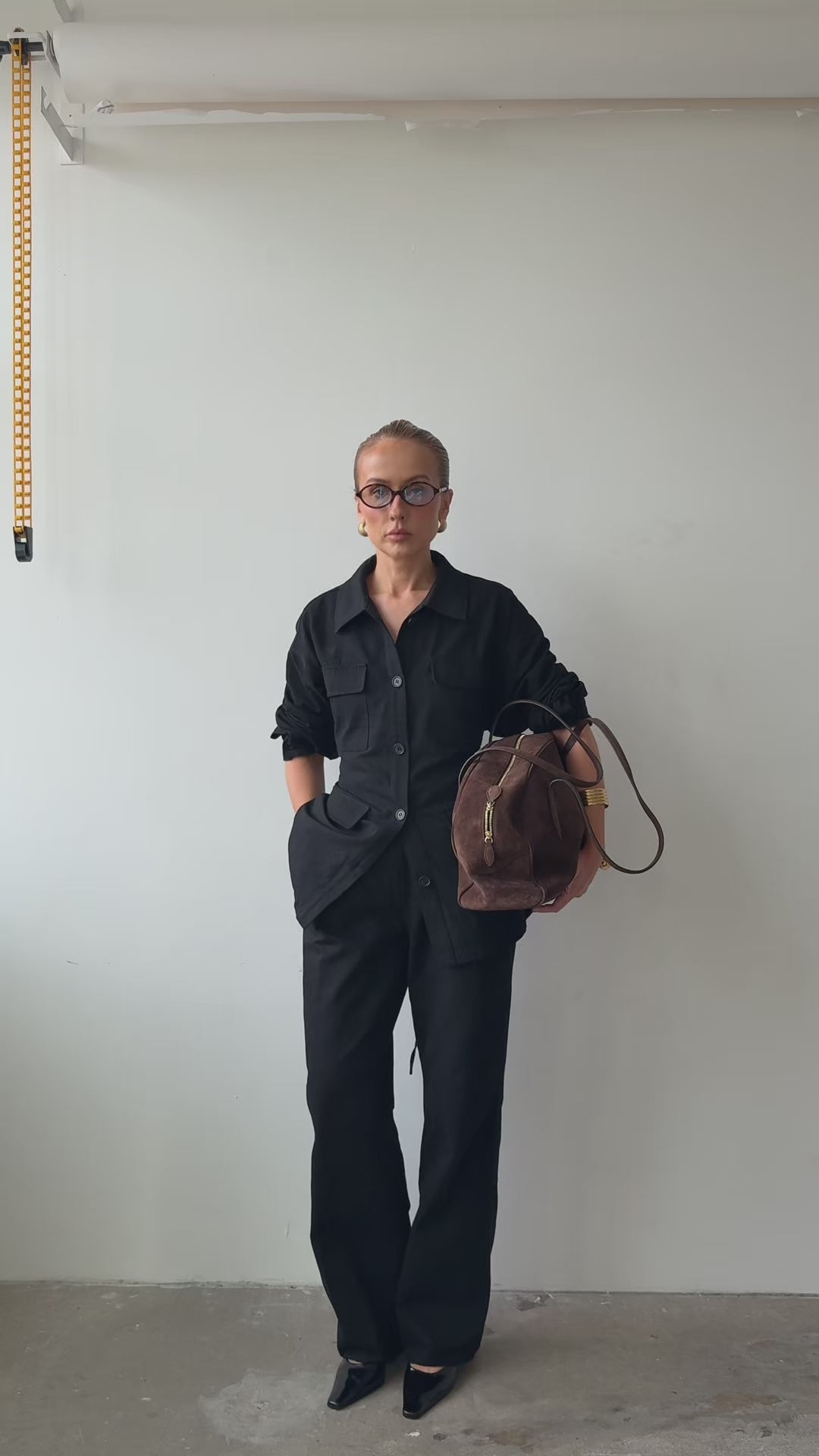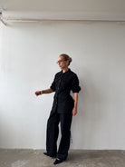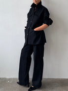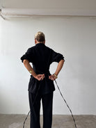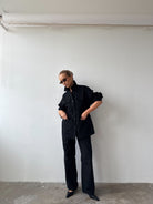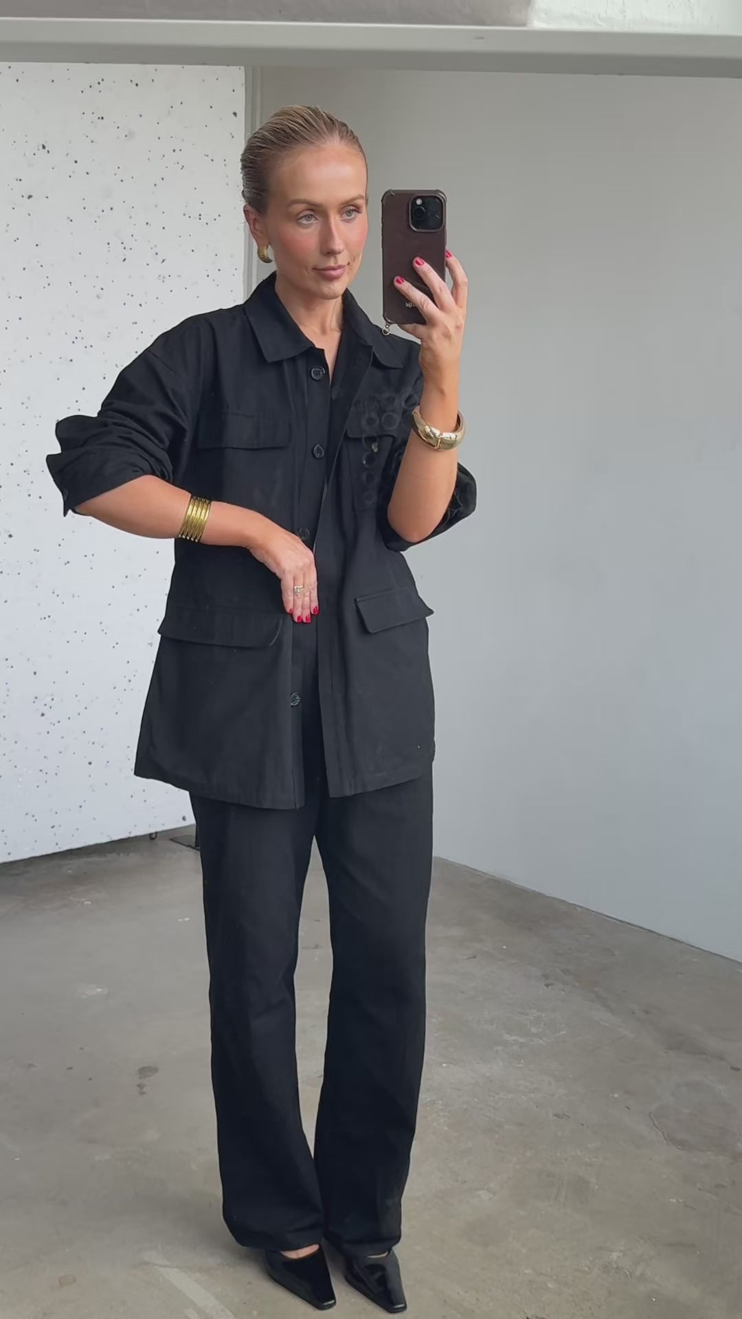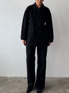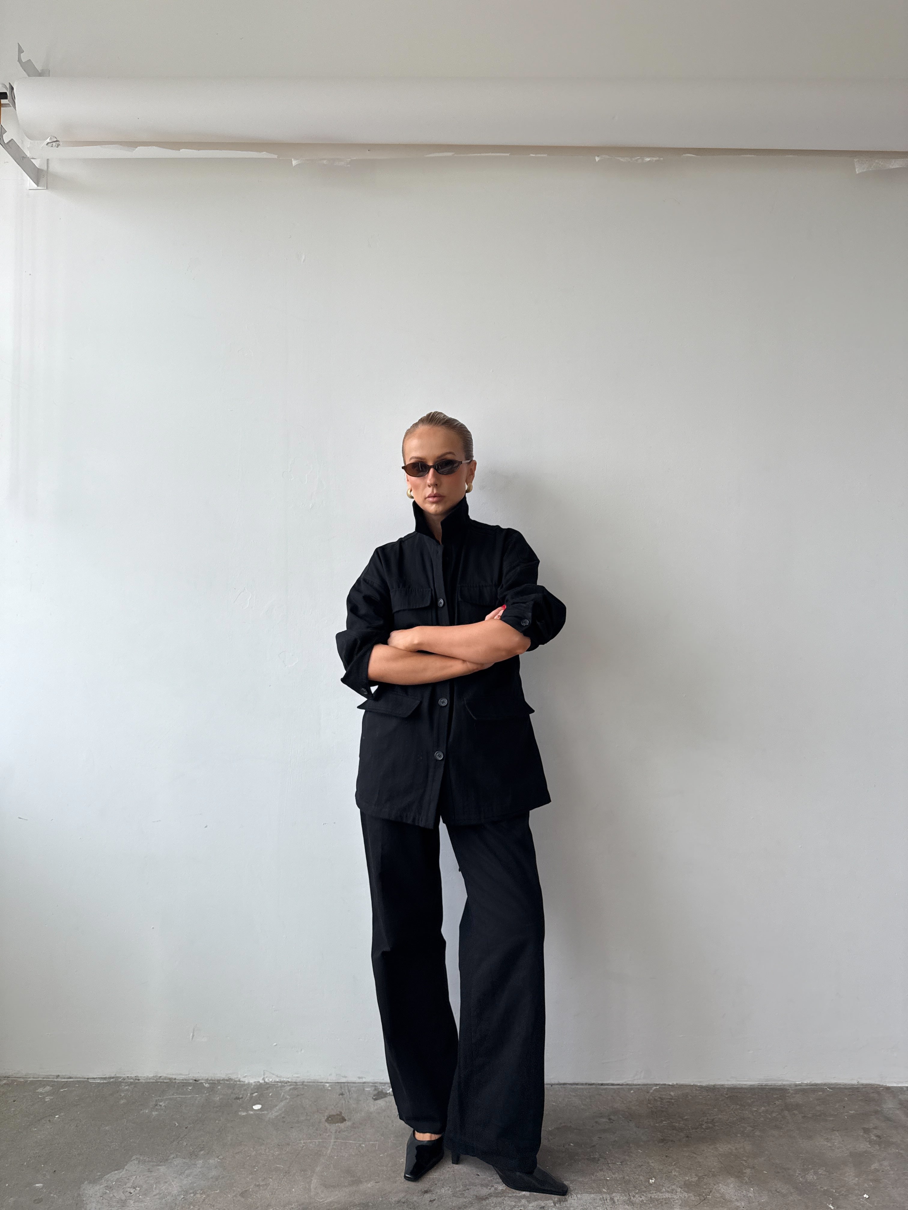 Made from structured cotton canvas in Jet Black;  it features four front patch pockets, wide sleeves, and a gently boxy, lightly oversized silhouette. A subtle tie at the back adds shape and adjustability, offering an easy balance of structure and softness.